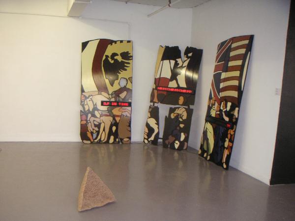 The works of Peter Joslyn form a meeting point between painting and sculpture. Predominantly wall- based, they derive imagery from a number of diverse sources - postcards, the hills of Bavaria, the clothing of American cheerleaders, LED wall displays from Wall Street and so on. For instance, the work exhibited in Bass Diffusion Model is a subversive appropriation from a Labour Party tapestry, depicting a march. The artist made the pictural representation on a wooden boarding. Formally simplified and flattened, Joslyn’s version of the Labour Party tapestry is also ornamented with ironic scrolling LED texts. The work is inspired by the artist’s need to escape – to escape from his surroundings and the dreaded normality of life, and the desire to find idealism without content. The pursuit itself is the goal.