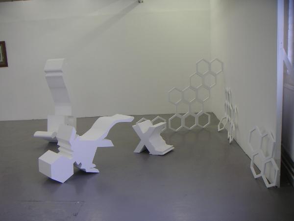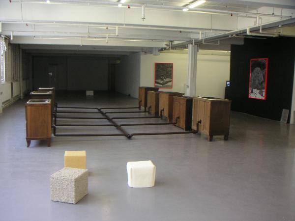 Objets Externes (2005) results from a combination of methods and questions which usually are used in the realms of both classic sculpture and architecture. This series of five wax cubes uses imprints and hesitates between the presence and manifestation of a non-site. Using a casting technique, Weber took the imprint of a real surface in order to make it appear in positive in the gallery space, as if it was a way to introduce a new skin taken from the outside world and shifted into the exhibition space. Archiving the different textures of the urban architectural buildings, those cubes have been made with a rigorous folding process and remain as external skin imprints.