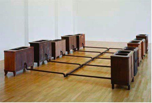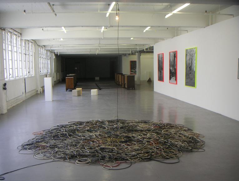 January 2001 : power cuts paralyzed California. This marks the beginning of the work Restore Hope. Since that year, the artist has been collecting electric cables he found on disused appliances on the street. Soldered together, they create a 1.1 km extended cable. The aim of this action is to connect this cable from the artist’s workplace directly to Silicon Valley in order to avoid any other power cuts. Julien Berthier’s work “consists of inventing or creating means of construction, mostly using vanishing tricks, illusion, modification and displacement. A “classic” parquet floor and the container that holds it will go on a tour of the world, hoping to gain an “exotic” status through its journey, to change its nature simply by the mechanical virtue of the transfer.
