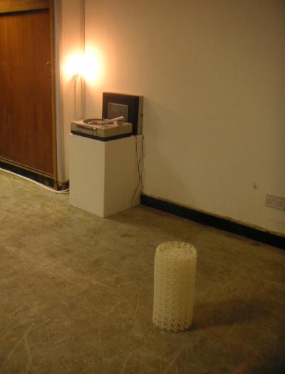 This musical creation, still in process, will last about three hours. For the exhibition, it is reduced, fragmented and diffused into three different points of the space following the logic of a trip. In the first room, a fifteen minutes-long extract is broadcast in loop, by little bell shaped speakers designed, to be audible by the visitor only when he comes under this set. In the second room, two shorter selections are offered by a cd-player with headphones. It means that it is the viewer who decides to start up the device and to voyage/sail between both the tracks of the CD. In the last room, the device is more important (bigger speakers with an audio-bass amplifier) and broadcast sequentially four short pieces interrupted by long silences. This piece is partially audible from the nearest rooms in the exhibition space. Originally, Pierre Yves Macé’s composition has been created as a reference to Walter Benjamin’s Paris, Capitale du XIXème siècle, and especially to his Parisian passages, which analyse like a witness and are symbolic of the emergent industrial modernity. It is made quasi-exclusively with samples from the 20s or 30s, which are conceived like “musical products” and valorised symbolically as emblems of the mass production of records from the beginning of the 20th century. All the song voices are systematically erased and the artist keeps only the instrumental introductions, which become some commonplace melodic formula played by any orchestra or pianist. These samples are treated by a montage of cuts and superimpositions with a lack of differentiation. Thus it reveals the interchangeable nature of these samples and echo the collage tradition of the 20th Century avant-gardes. Emptied of their singularity and of their commercial value, these samples signify simply a nostalgic feeling, undefined and collective, as Benjamin explained it like the circularity of fashion. The sound contents are by different transformations precisely located on some samples (stretching, loop, reverberations…) to give back to these extracts a particularity and to recreate a new form of continuity, which would reveal some potentialities which had never been realized. Benjamin’s concept of history is one of violence is exerced by the main culture on a past which left no trace.