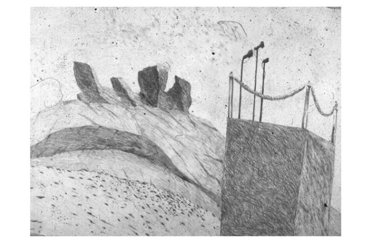The grease was the initial software programme. The second programme introduced was automated projected image technology projected on to the hardware (tableaux surfaces of various kind - hardboard, canvas, etc.). Some later Grease Works use both kinds of software (grease and automated projected image technology). Mainly these works have remained in the form of the initial drawings.[2] Throughout the nineties the largest body of work was constituted of these kinds of materiel. The first work of the nineties which realized the work past the drawing stage is Work by a Split-Brain Artist, shown at the IMMAGlen Dimplex Prize exhibition at the Irish Museum of Modern Art in 1994. This particular realization is a variation on an initial plan which remains in the form of a series of plans/drawings and notes, which was a characteristic way of working with this body of work. And many of these plans/drawings remain in this form, although should a suitable opportunity arise I would still like to realize them (see note 2). Some of the later works (from around 1995) would, ideally, incorporate a software which continuously develops.[3]