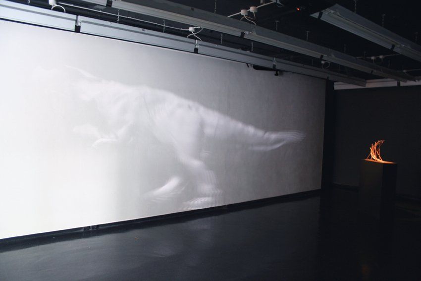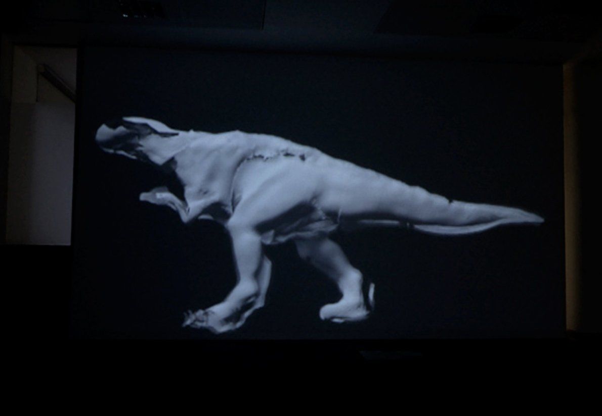 Kris Emmerson’s work is inspired by modes of simulation within the digital realm. Our perception and understanding of the world around us is being constantly re-presented and re-defined by computer generated imagery within the TV and Motion picture industries. By releasing these 'fantasies' from the limitations of a narrative driven context they can exist as autonomous entities, offering a momentary sense of wonder; a time and place outside of the now. ‘Dyathinkeesaurus’, 2010, is a projection modelled from a crude 3D scan of a child’s toy the dinosaur that marches on relentlessly. Its body is cracked and torn, the fragile crust of its hollow form at odds with the weight of its step. It takes its title from the old joke “What do you call a dinosaur with one eye?”