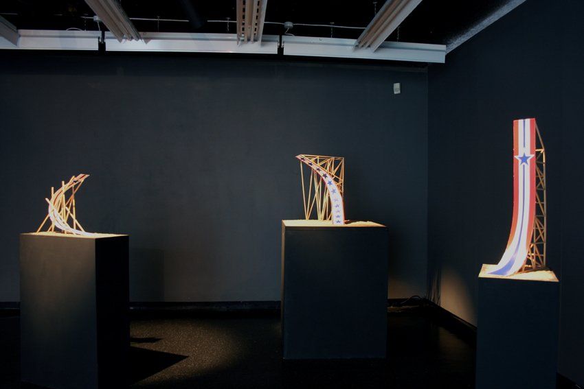 Tom Dale presents a sculptural series of stunt ramps gone horribly wrong: ‘The Cow Palace ’ 2008, ‘The Astrodome’, 2008 and ‘Pacific Colosseum’, 2008. The distorted ramps are at once loaded cultural signifiers and restrained objects of formal contemplation. For Dale the ramps project a leap of faith, but where this blind optimism is headed is unknown. Some are turned on end, driven into the ground or twisted like ribbon, leading to the most devastating of trajectories: they take the daredevil’s bravado to its absurdly logical conclusion. The suspension of belief demanded by this directionless excess marks a point of fascination for the artist, as do the analogous political ideologies in the name of which such stunts are regularly performed. Evel Knievel has formed a recent focus in Dale’s work: the iconic American stuntman was both a philandering ex-criminal with an instinct for self aggrandisement and a national hero, the living embodiment of patriotism’s paradoxical blend of recklessness and order. Tom Dale appears courtesy of Poppy Sebire Gallery.